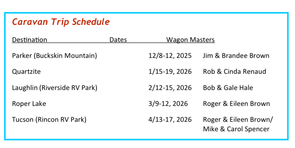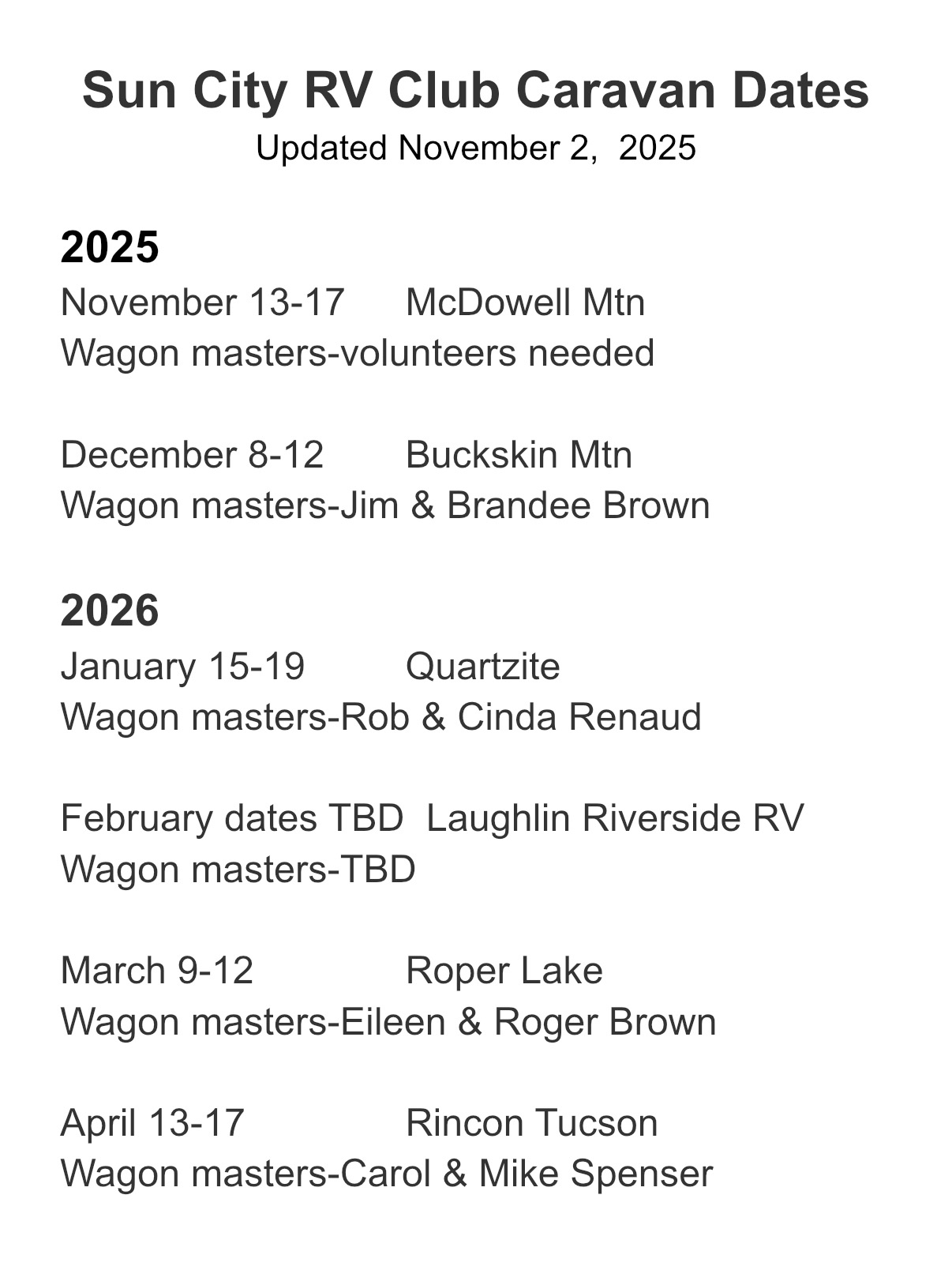 Each participant needs to call the resort at 800-227-3849 and make their own reservation. Choose option 5 which will contact you with the RV Park office. When you call in use the code SUN26 when you make your reservation. This will get you the group rate. Be sure to tell them you are with the Sun City RV Club, and then report your site number to the Wagon Master. The sites cost between $30.00 and 45.00 per night depending on amperage and whether you want a pull-thru or back-in. Speaking of Wagon Master, we do not have one yet. Don’t be bashful about volunteering, because it should be an easy trip. Sign-ups will start at the December Caravan meeting.